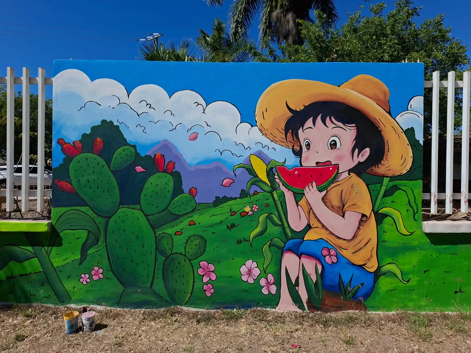 La belleza inquebrantable de la naturaleza local: La exuberante flora característica de la región también encuentra un espacio protagónico en esta composición artística. Con delicadeza y precisión, el mural integra elementos naturales que embellecen el entorno y recuerdan la riqueza ecológica y paisajística que forma parte intrínseca de la identidad de El Tamarindo, conectando a sus habitantes con la tierra que los nutre y los ve crecer.